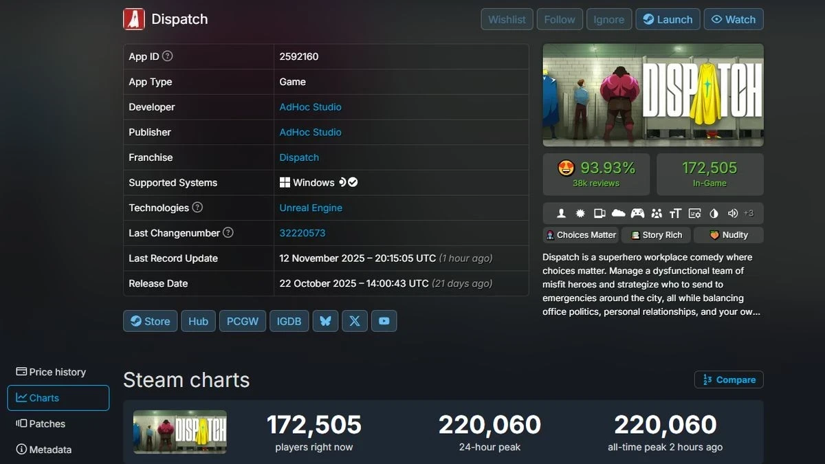 Обложка: скриншот DispatchНовые эпизоды Dispatch постоянно приводили к новым рекордам по пиковому онлайну игры в Steam. И заключительные «серии», которых вышли 12 ноября, обернулись тем же самым — 220 060 одновременных пользователей.