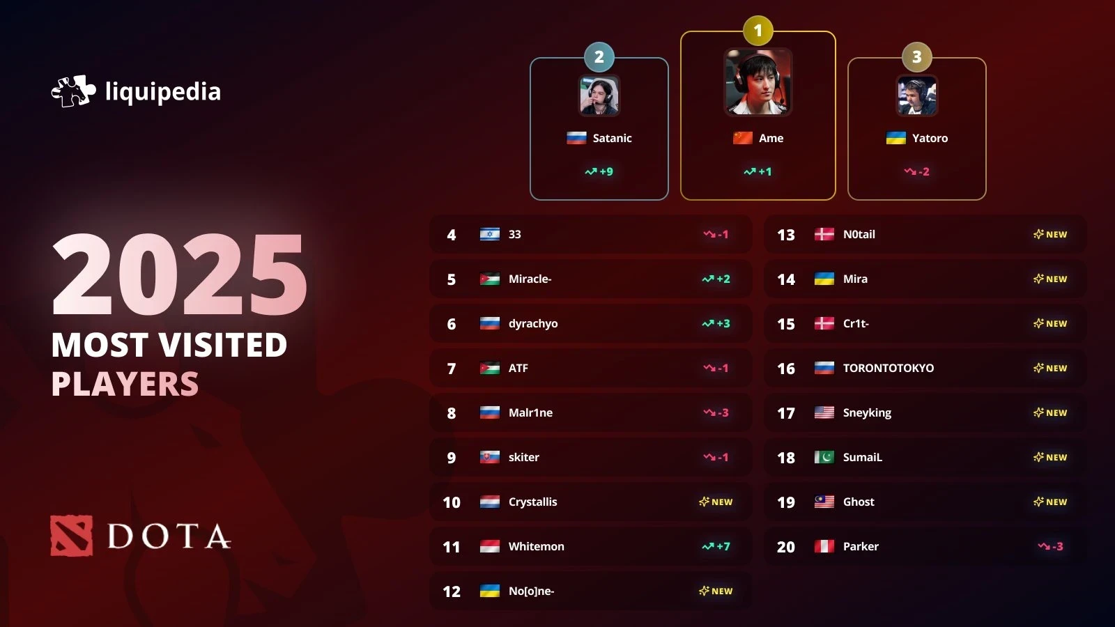 Ame обошел Yatoro в Dota 2 и стал самым популярным игроком 2025 года на Liquipedia